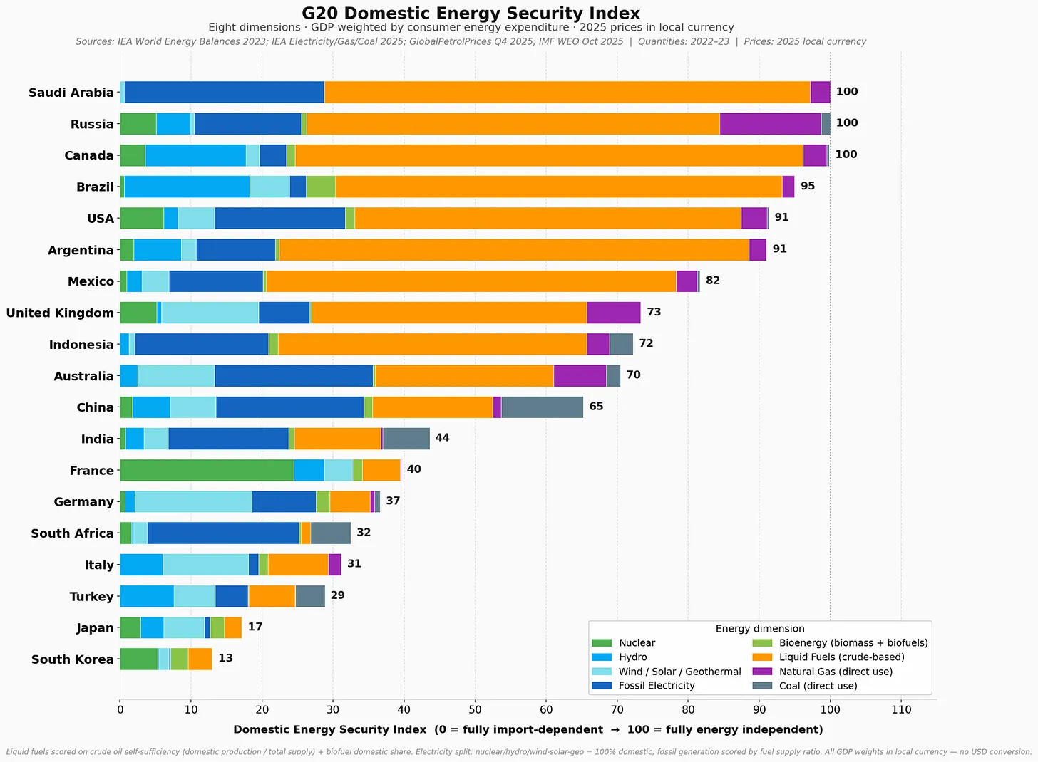 For each of the eight energy dimensions I assign a security score between 0 and 100, where 100 means the country produces at least as much domestically as it consumes, and 0 means complete import dependence. I weight each dimension by the share of that fuel in consumer energy expenditure, computed in local currency as a percentage of GDP. The index is then the expenditure-weighted average of the eight security scores — that is, the sum of (score × weight) divided by the sum of weights. The resulting index can range from zero to 100.