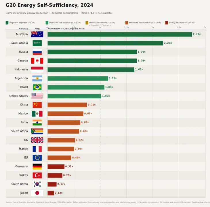 Last week I was playing around with the data of the Energy Institute’s 2025 Statistical Review of World Energy and I created a figure that went a bit viral on social media and resulted in some constructive comments.1 That figure, shown below — which I called “a simple metric of energy security among the G20” — shows a simple ratio of domestic energy production to domestic energy consumption.