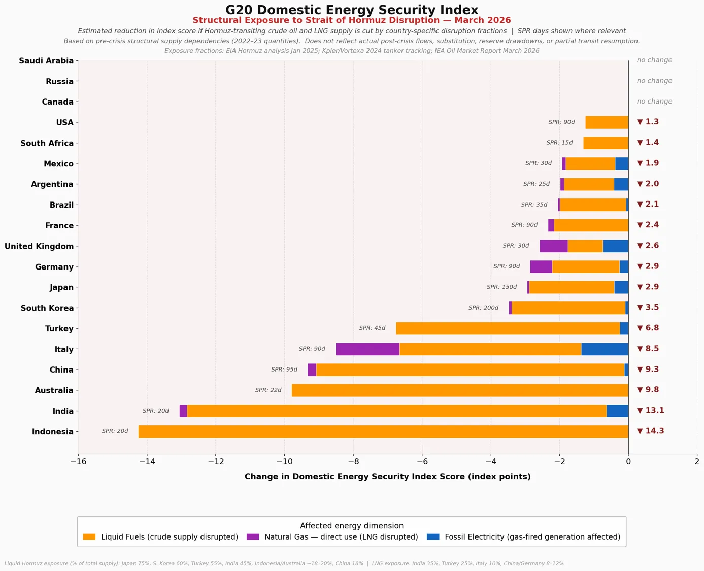 I was also curious about what the index would say about each country’s structural exposure to the closure of the Strait of Hormuz, so I estimated how the index would change based on how much oil and natural gas transited the Strait (based on data from January 2025). The results of that sensitivity analysis are shown below, ranking countries by how the crisis would impact their rankings and index scores.