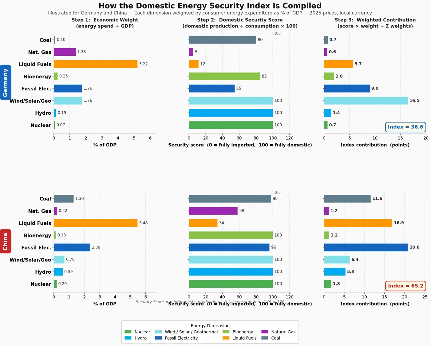 - China scores 65. China is nearly self-sufficient in coal, which is the primary fuel for its electricity generation and carries one of the heaviest GDP weights in the index. Its main vulnerability is liquid fuels.