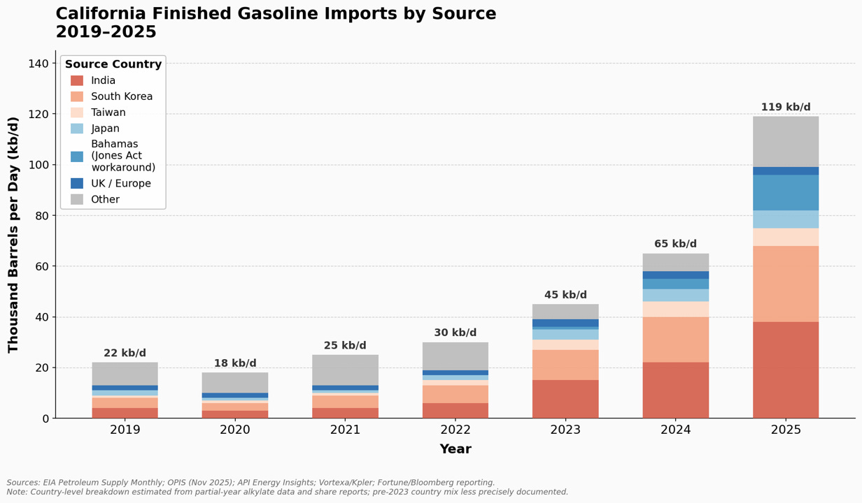 The THB Energy Security Index scores each G20 country across eight energy dimensions: nuclear, hydropower, wind/solar/geothermal, fossil-fuel electricity generation, bioenergy, liquid fuels, natural gas, and coal. Liquid fuel security is measured using crude oil self-sufficiency: domestic crude production divided by total crude supply. There are some complexities that I ignore, such as trade in refined petroleum products, for instance, in California — shown in the figure below. I include bioenergy, as it is important in several G20 countries such as Brazil (sugar cane ethanol) and the United Kingdom (imported wood pellets at the Drax power station).3