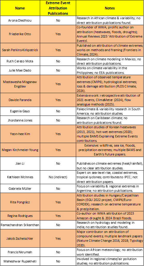 The chapter’s author list shows that it is stacked with people who focus on extreme event attribution — far out of proportion to their presence in the field. With the help of Google Scholar and ChatGPT I created the table below, which shows that 9 of the chapter’s 20 authors focus their research on extreme event attribution. Two of the three coordinating lead authors focus on EEA. Few of the authors, if any, have expertise in the IPCC’s conventional framework for detection and attribution, and some have no publications on either detection or attribution.