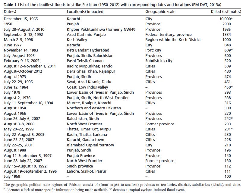 The table below shows that Pakistan has a long history of large loss of life related to flooding across the low-lying nation, reflecting enormous vulnerabilities in a region prone to extremes, even in the absence of strong trends.