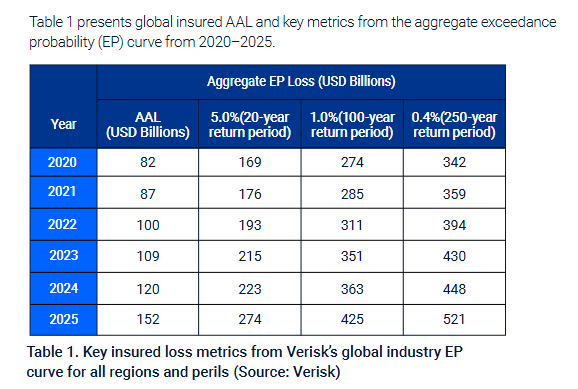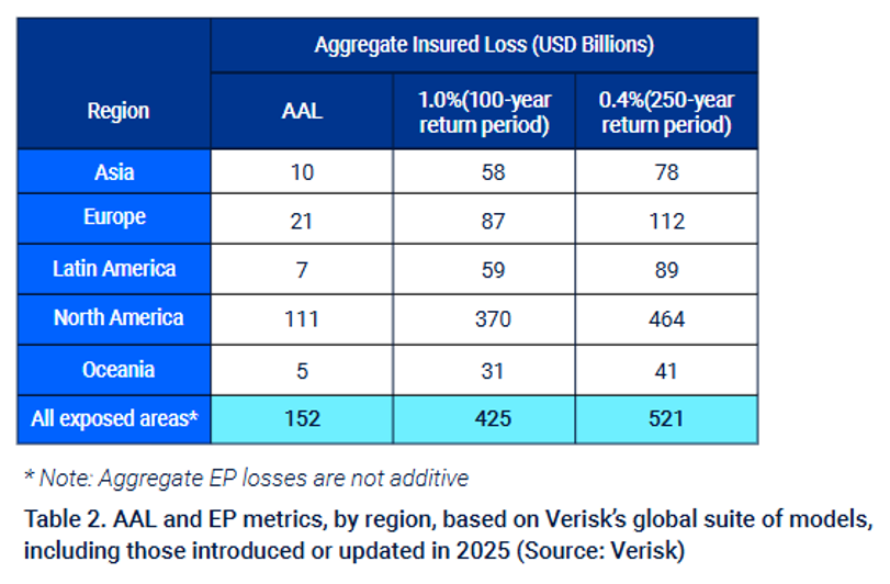For 2025, the catastrophe modeling firm Verisk provided their estimate [2] — $152 billion in insured losses and $395 billion overall (i.e., insured plus uninsured, and including non-weather-related losses). Insured losses make up ~38% of the overall 2025 total, with the table below showing a regional breakdown for Average Annual Loss (AAL), and 1% and 0.4% loss estimates.