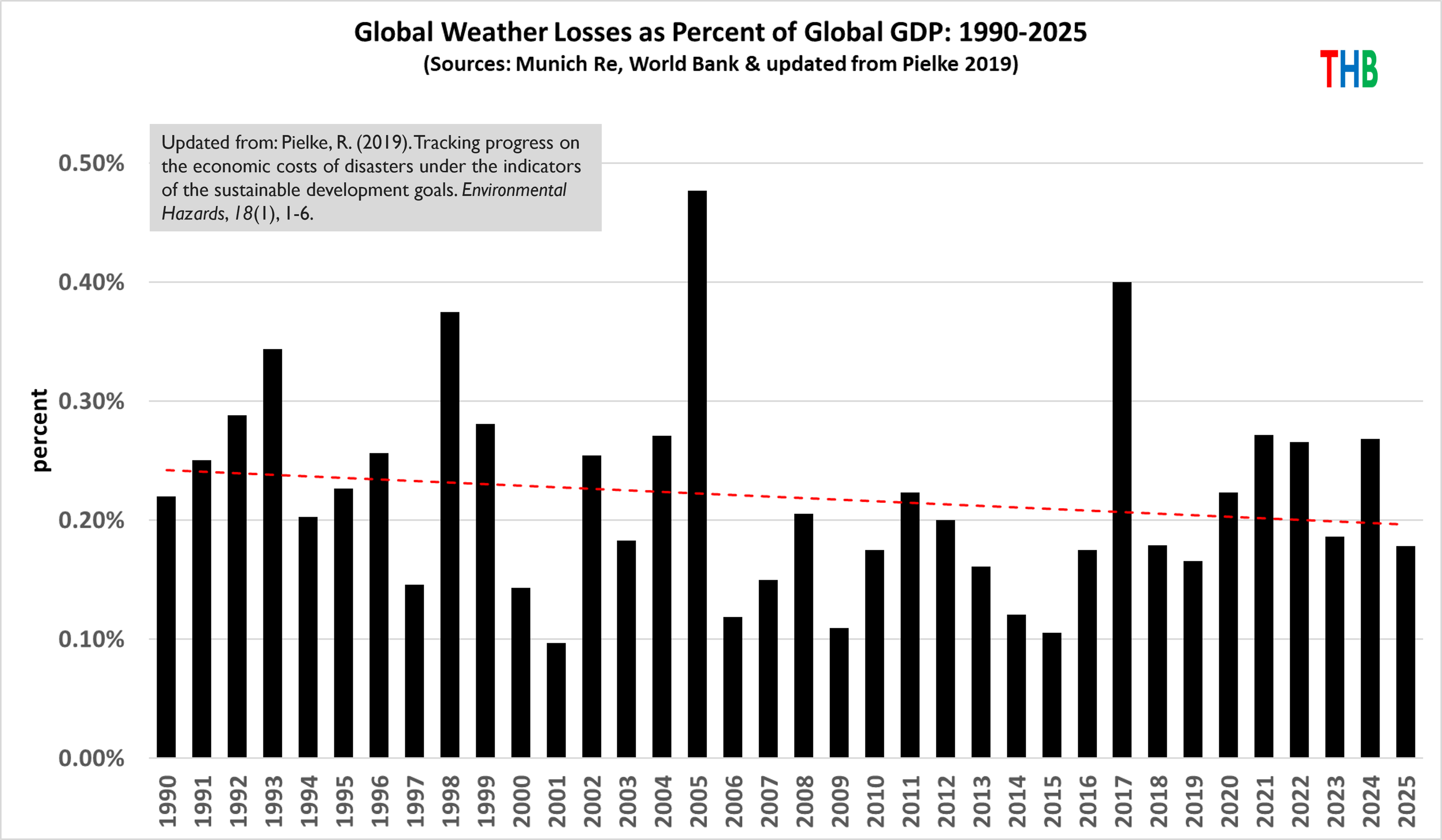 Munich Re, a global reinsurance company, has explained that they consider their time series of losses to be reliable since 1990. In my analyses, I use their data (along with GDP estimates from the World Bank) and in the figure below update the analysis of Pielke (2019) through 2025. [5]
