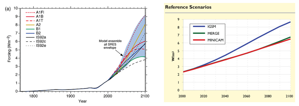 Today, I focus on projected radiative forcing,1 which in lay terms is a measure of the degree of change in the climate system resulting from the accumulation of greenhouse gases in the atmosphere (as well as other factors). A greater radiative forcing (measured in units of watts-per-meter-squared) means a greater change in climate, which is often expressed as a change in average global surface temperatures.