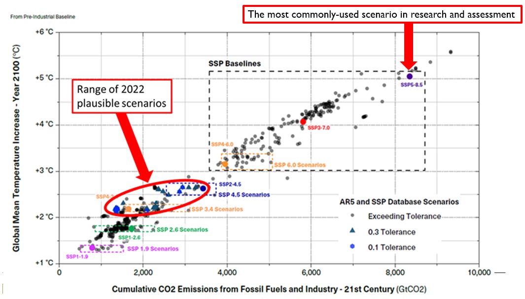 The dashed box in the figure shows the more extreme scenarios, ranging from SSP4-6.0 to SSP5-8.5. These scenarios are increasingly implausible, and many are now simply impossible.