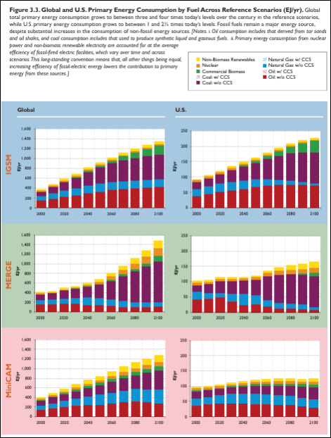 The 2009 EPA endangerment finding used scenarios that today are viewed to be too extreme. The main reason why the community’s view of future emissions has changed to less extreme scenarios is the recognition that future energy consumption will not be dominated by coal. For example, in the image below, from the 2007 CCSP scenario report, shows that each of the three scenarios project that coal will be the primary source of energy in the U.S. and the world. No one believes that anymore.