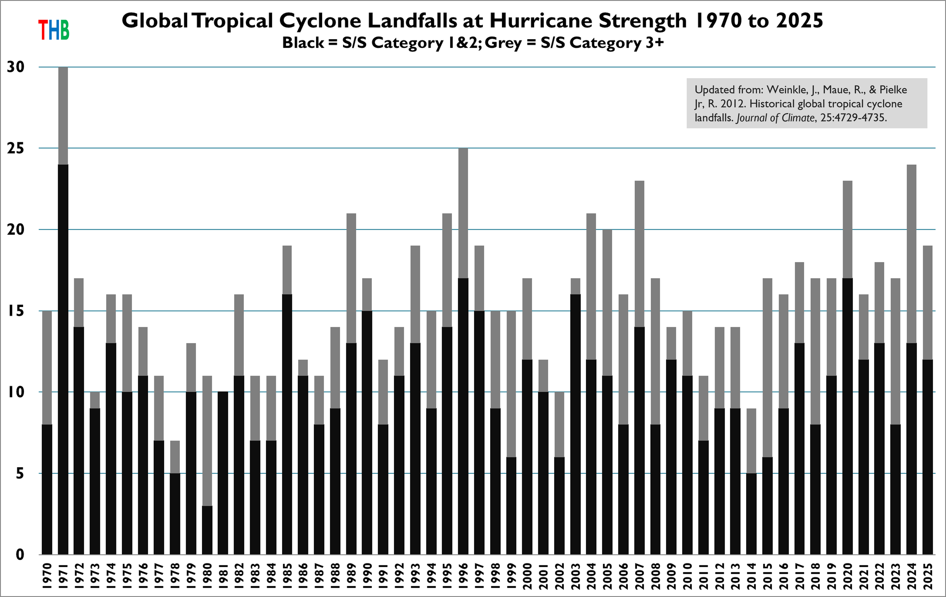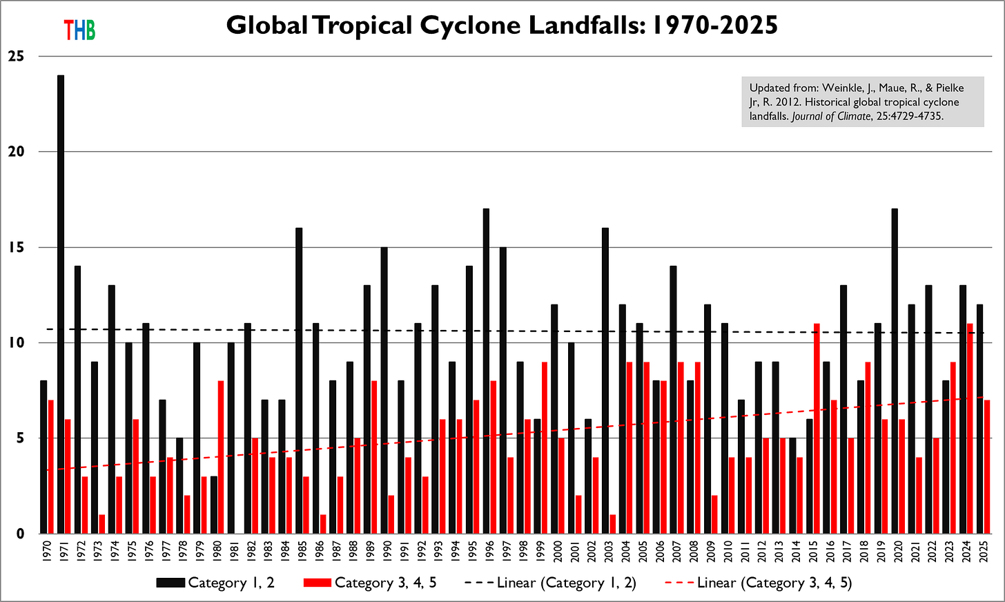 Back in 2012, Jessica Weinkle, Ryan Maue, and I published the first peer-reviewed paper presenting a time series of global tropical cyclone landfalls of hurricane strength.
