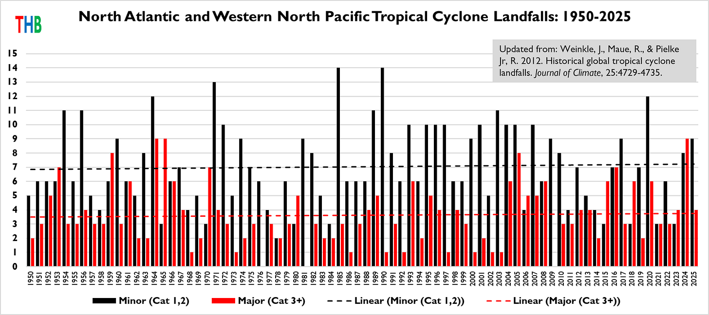 This longer term perspective leads me to conclude that the increasing proportion of major landfalling storms from 1970 to 2025 is encompassed by historical natural variability. You can find a much deeper dive on this issue at the post below: