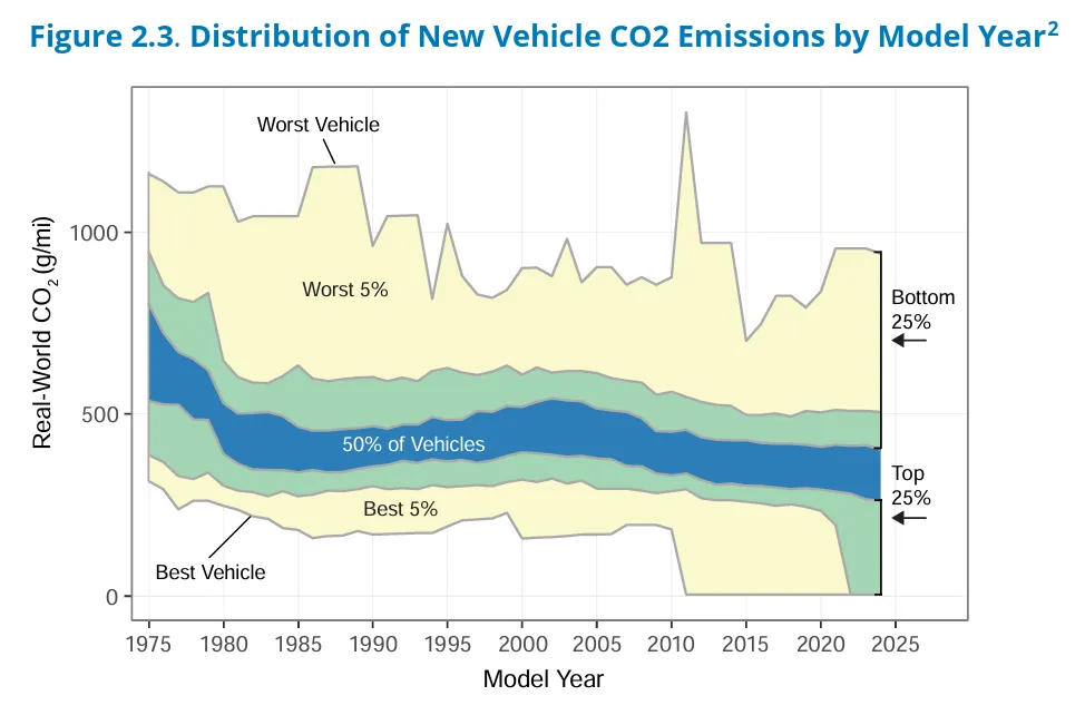 The figure below shows the distribution of CO2 emissions across new vehicles by model year. There is a slow but steady improvement over the past 50 years, and the emergence of EVs is obvious. However, there are few signs of a major step change in the fat part of the curve (i.e., middle 50%).