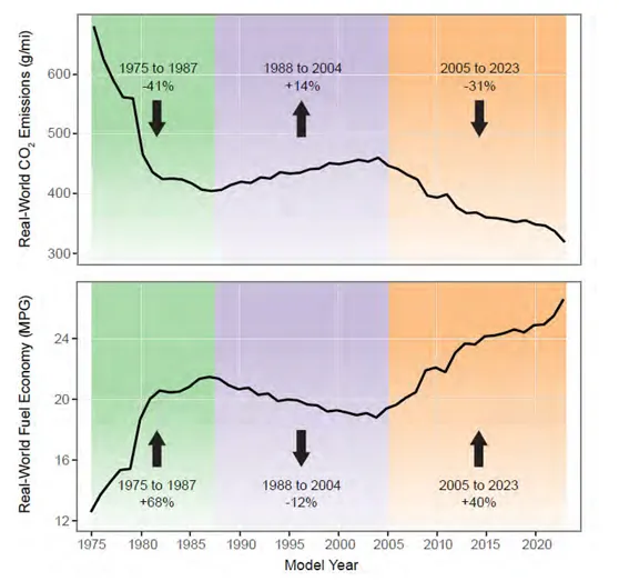 According to the EPA 2024 Automotive Trends Report, trends in U.S. auto fleet fuel economy and emissions fall into three distinct periods: