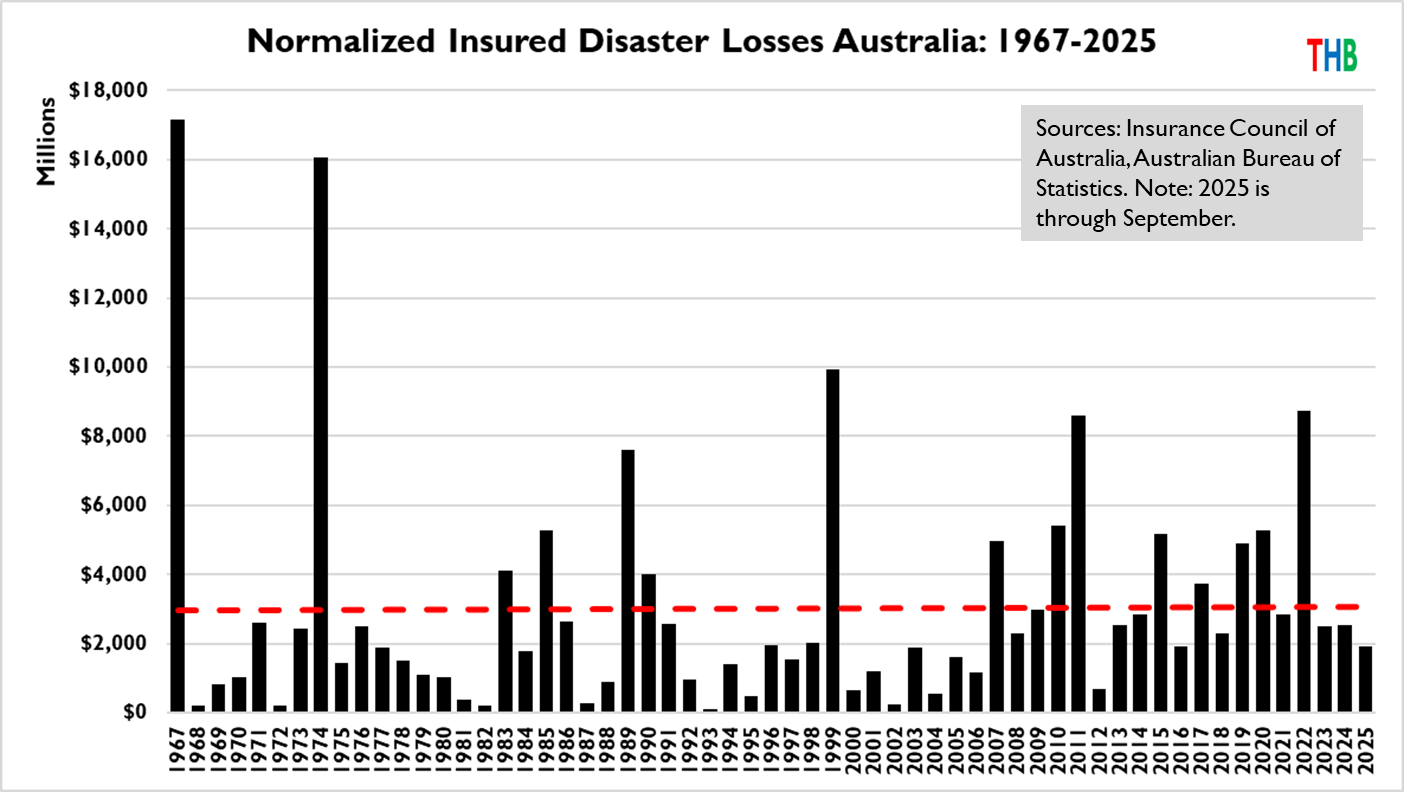 The figure below shows normalized Australian insured disaster losses from 1967 to 2025. [1] There is no overall trend, once losses are adjusted for societal changes. [2] The methodology is based on our 2019 paper: