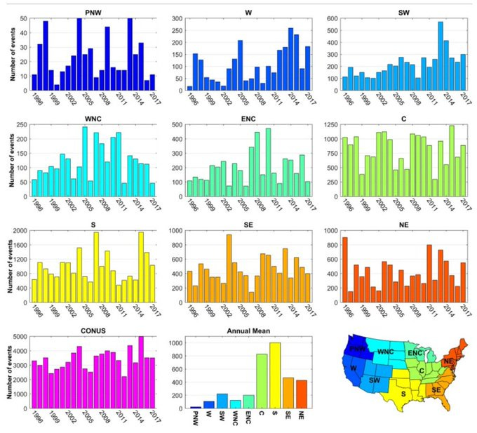 For instance, the figure below, from a paper in the Journal of Hydrology,1 shows a relatively short time series (that is, shorter than climate time scales) of flash flooding in the United States and its regions. The paper finds no significant trends at the national or regional scales, except in the southwest. Over the 20-years covered by the paper there was no increase in flash flooding in the Texas region or the U.S. overall, even as some metrics of extreme precipitation have shown an increase over the same time period.