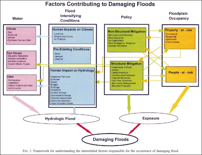 The figure below, from that paper, illustrates why it is not at all straightforward to go from increasing precipitation to increasing streamflow to increasing damage.