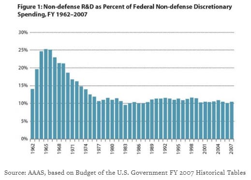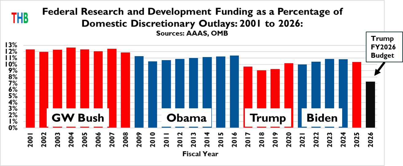During the administration of George W. Bush, R&D funding averaged 12.5% of discretionary spending — Obama, 11%; Trump 1, 9.5%; and Biden, 10.5%. The FY2026 budget proposal by the Trump administration cuts R&D funding to 7.3% of the discretionary budget, which would be by far the lowest since at least World War 2.