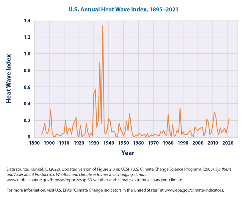 The figure above has been used by the EPA as an indicator of heat waves from 2008 to present, and is based on a paper I co-authored in 1999 (see Figure 11 in that paper). It is correct that the 1930s were most extreme by this metric, but it is also true that there has been a modest increase i heat waves since the low values of the 1960s and 1970s.