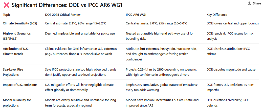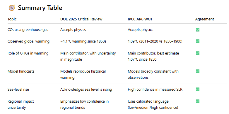I asked ChatGPT to summarize areas of overlap between the CWG report and the IPCC AR6 Working Group 1 report. The results are summarized below, indicating substantial areas of agreement between the reports.
