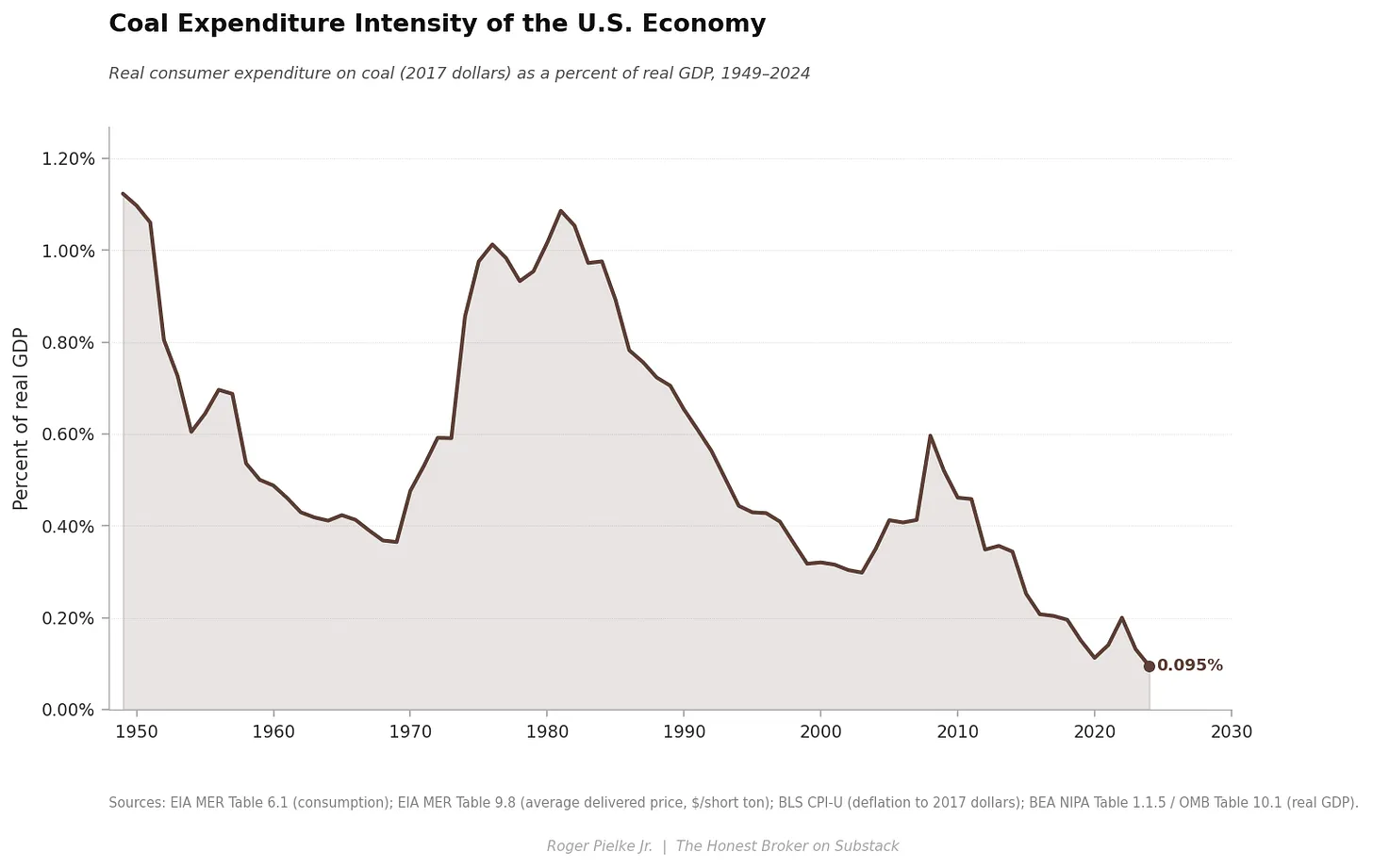 Coal expenditure intensity peaked at ~1.1% of GDP in 1949, when it was the dominant fuel in the U.S. economy and then approached this peak again in the early 1980s. By 2024 it had fallen to ~0.1% — about one-tenth of one percent of GDP.
