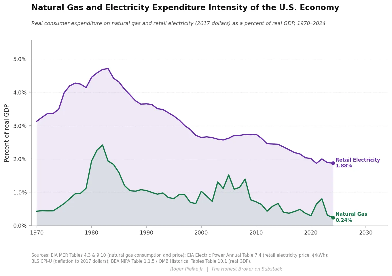 Every fossil fuel has seen physical intensity declines of 64–84% since 1970. In contrast, retail electricity physical intensity has fallen only ~39% over the same period, shown in the figure below.