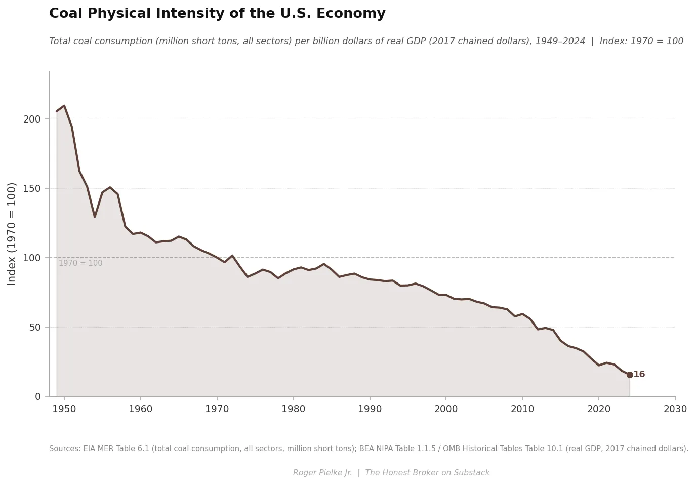 1. Physical energy intensity has fallen dramatically across every fossil fuel since 1970