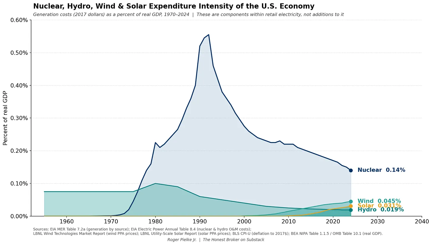 Now consider the entire low-carbon electricity portfolio: In 2024 the expenditure intensity of nuclear, hydro, wind, and solar combined totalled ~0.24% of GDP. That is roughly one eighth of direct spending on fossil fuels, while collectively powering around 40% of U.S. electricity (including nuclear at ~18%, hydro at ~6%, wind at ~10%, and solar at ~7%).