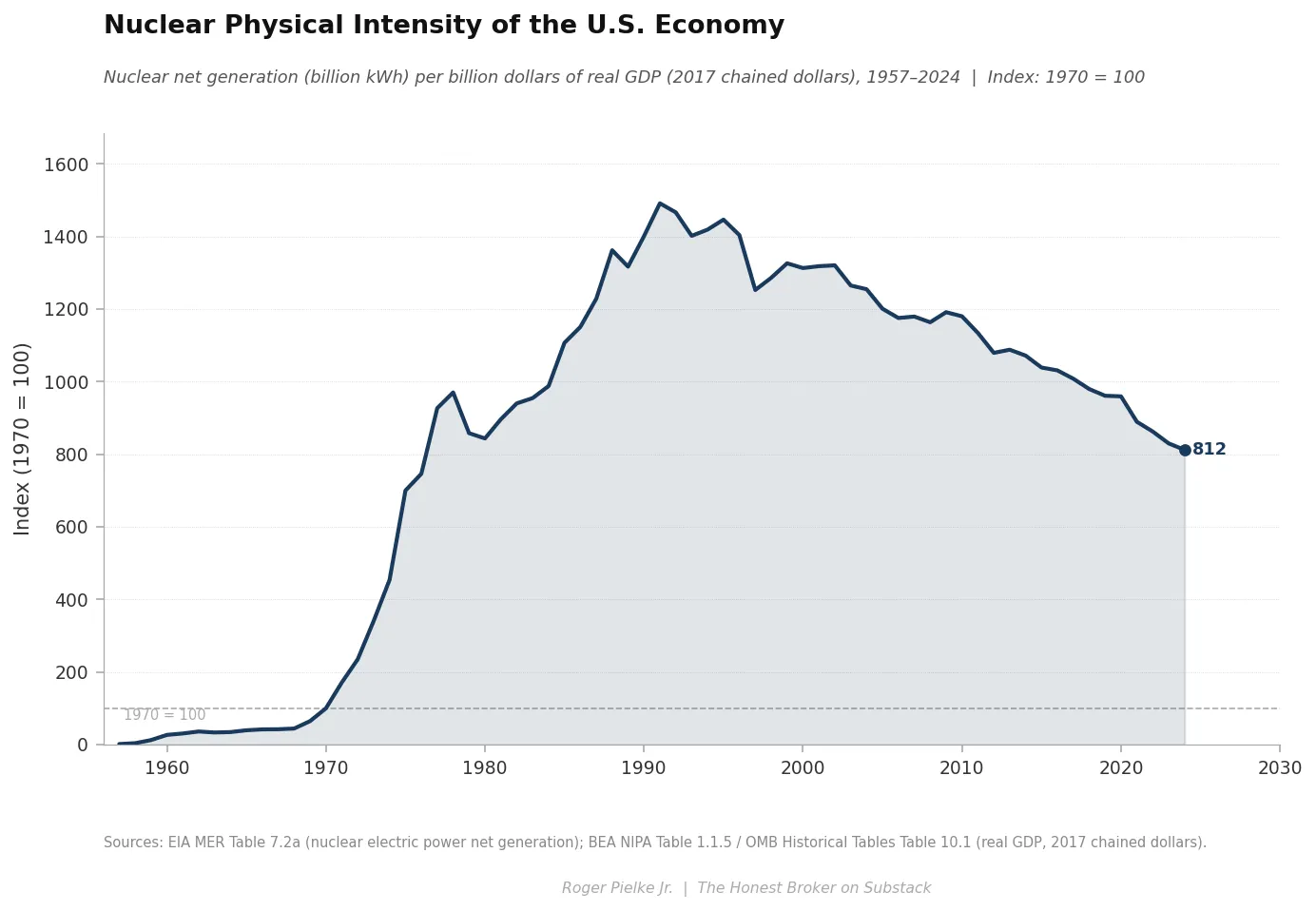 Nuclear physical intensity — kilowatt-hours per dollar of real GDP — rose about 15x from 1970 to its peak in the early 1990s as the U.S. built out its reactor fleet. It has since fallen, with no new reactors for decades, but it remains more than 8x higher relative to 1970 (1970 = 100).