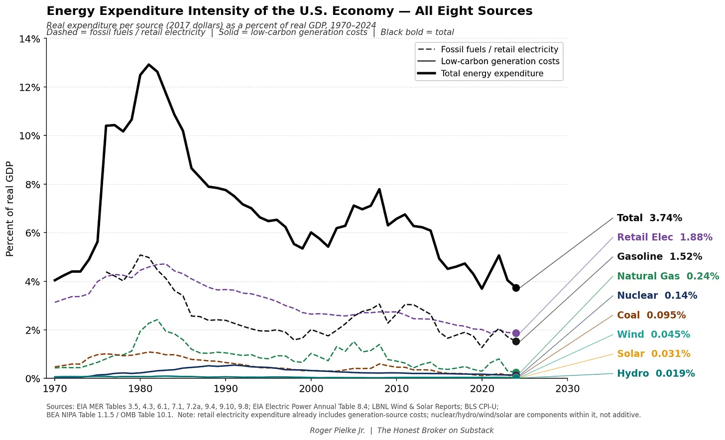 Direct fossil-fuel-spending — gasoline, natural gas, coal — still accounts for roughly 1.9% of GDP in direct expenditure, about 8x more than all low-carbon generation sources combined.