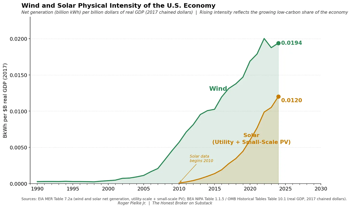 Wind physical intensity has increased roughly 48x since 2000. Solar physical intensity has increased roughly 150x since 2010. Both are still rising rapidly.