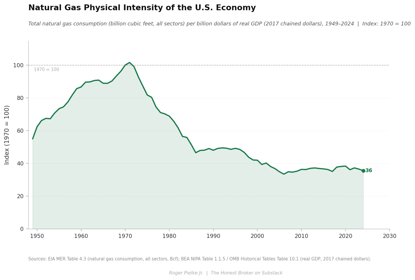 The next figure below, natural gas physical intensity of the U.S. economy, shows a dramatic increase from ~1950 into the 1970s, followed by a sharp decline into the 1980s followed by a slower decline and plateau after the 2010s.