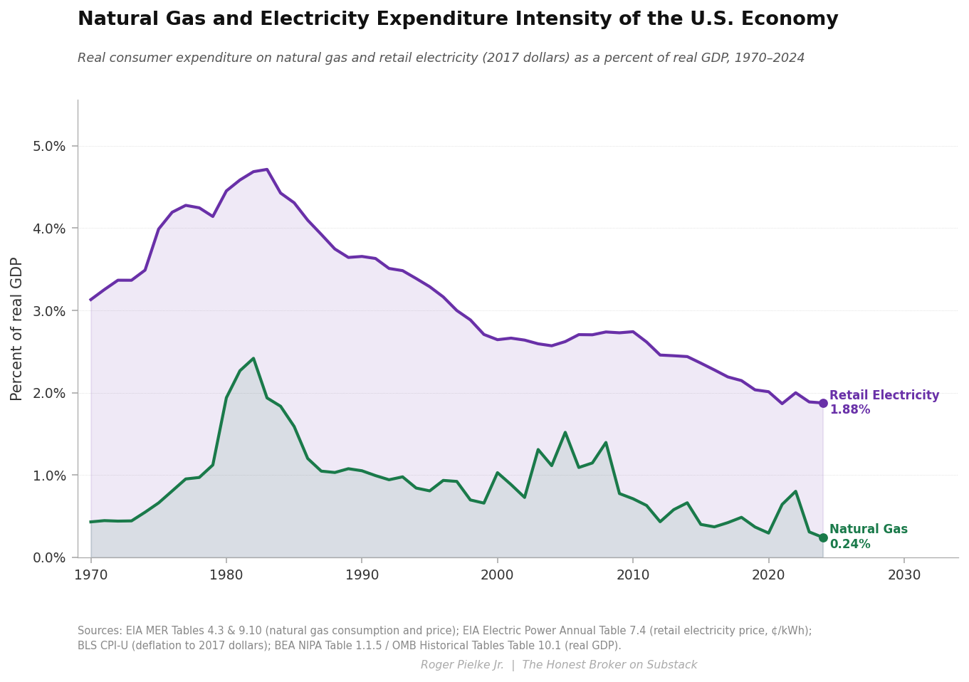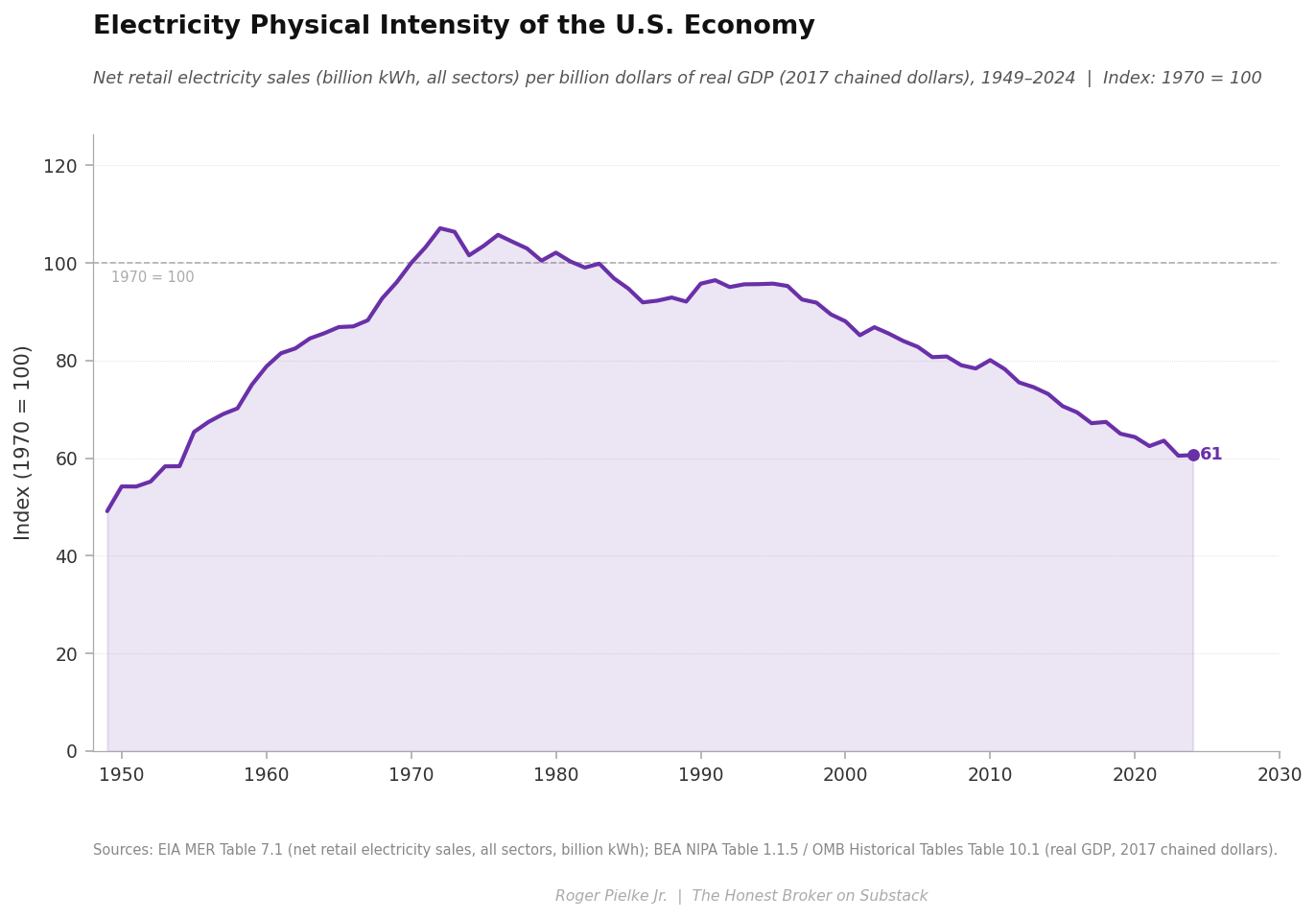 Every fossil fuel has seen physical intensity declines of 64–84% since 1970. In contrast, retail electricity physical intensity has fallen only ~39% over the same period, shown in the figure below.