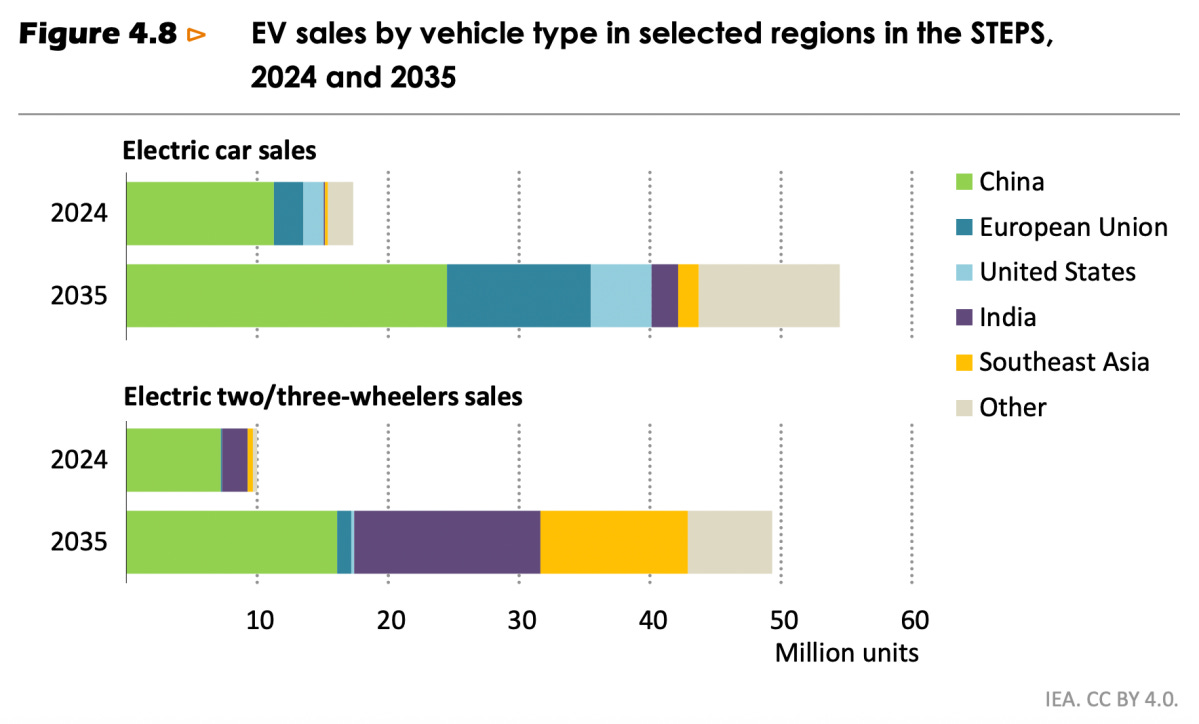 This figure shows that the use of electric vehicles is projected to rise dramatically around the world, with the vast majority of the increase expected to occur outside the EU and U.S. The increase in projected sales of two- and three-wheelers (think motor scooters and tuk-tuks) approaches 50 million per year in 2035.