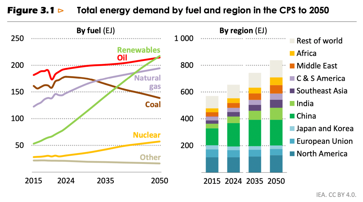 The graphs above show that global energy demand is projected to increase significantly by 2050. Of note, all of this increase occurs outside of Japan, Korea, North America, and the European Union.