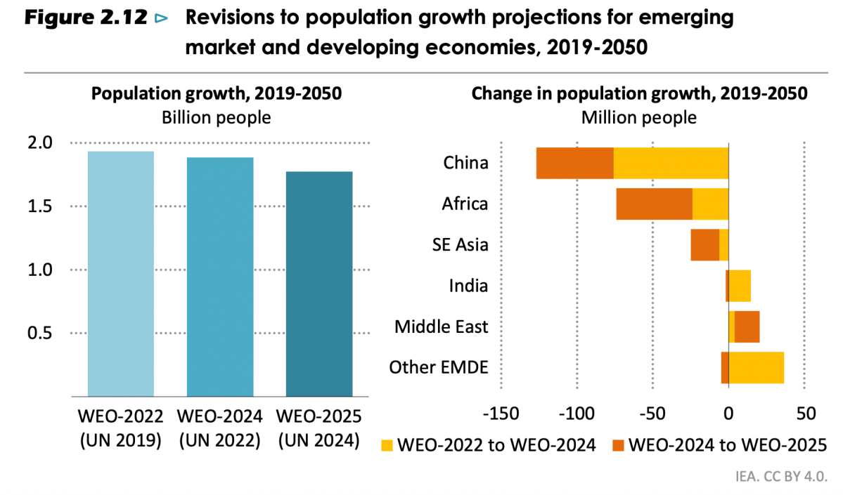 These graphs from the IEA 2025 WEO are remarkable. They show that in just one year, from 2024 to 2025, projections of the global population in 2050 dropped by about 100 million people, based on United Nations estimates, with most of the decrease in Asia and Africa.