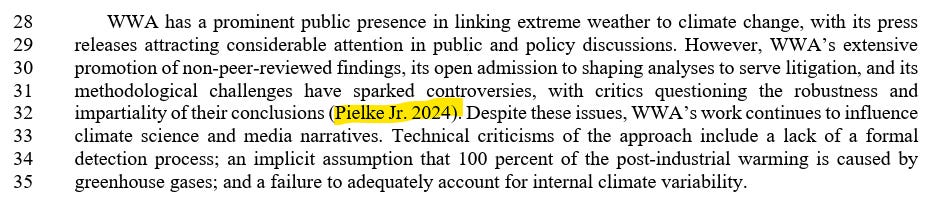 This passage cites a post accurately from here at THB — the first post in my series on Weather Attribution Alchemy. As the series has six parts, with many citations to peer-reviewed articles — the CWG might cite the entire series. While the posts here at THB are always solid, I would recommend supplementing any references to Substack posts with citations to the relevant peer-reviewed literature, of which THB provides many in support of its analyses and arguments.