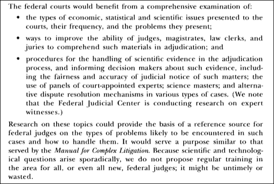 The Manual’s origins go back to 1988, when Congress directed the Judiciary to empanel an expert committee to assess problems with the performance of federal courts and recommend options for improvement. The resulting report, published in 1990, recommended a need for improved guidance for judges on how to handle complex issues of science and technology, and suggested the creation of a reference manual (see the excerpt in the screenshot below).